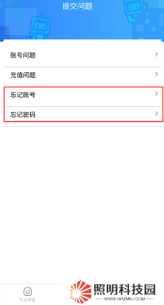 3、根據自己的情況選擇“忘記賬號”或者“忘記密碼”的選項來進行申請。