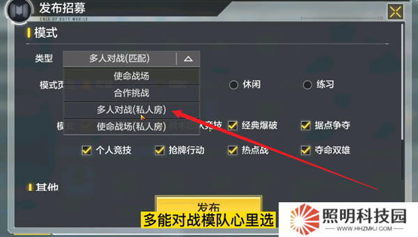 4、就會彈出一個發布招募的模式選擇界面,這個時候只要在模式類型里面選擇【多人對戰(私人房)】就行。
