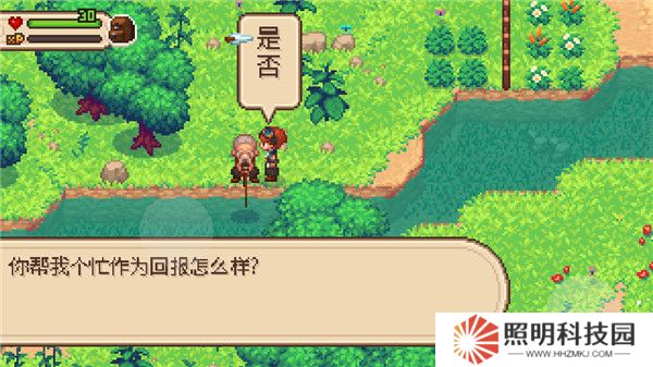 在沒有武器的情況下路上的灌木叢會擋住你的去路,有武器時只需點擊攻擊鍵就可以擊毀灌木叢,在擊毀灌木叢后有幾率掉落補血的紅心和金幣,屏幕左上角綠色條是生命值,底下的黃色條是經驗值,擊殺怪物后獲得大量經驗值升級,在森林中如果遇到寶箱一定要面對寶箱點擊攻擊鍵打開寶箱,可能會獲得物品。