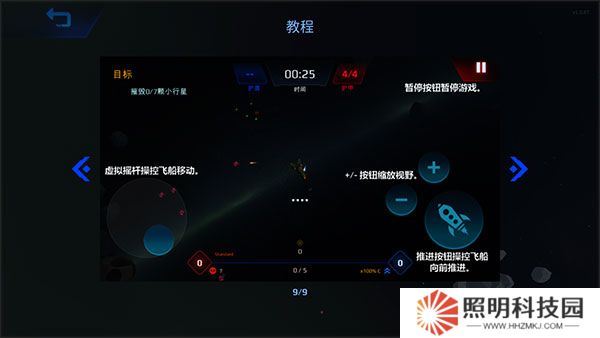 6、手機的操作方式如下圖所示,虛擬搖桿操控飛船進行移動,右下角的推進按鈕操控飛船向前推進。