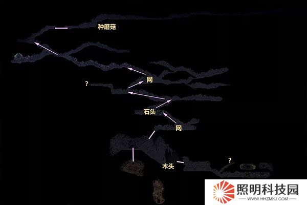 2、玩家們需要向上探索黑暗的礦洞,鋤頭挖通路后是一個上不去的高臺,在之前那個紫色綠色蘑菇長在一起的蘑菇洞,找空地將兩種蘑菇相鄰會種出一朵大蘑菇。