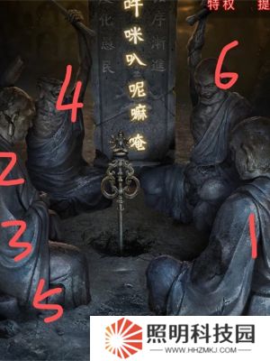 5、接著回到墳場將魚幡掛到大墳墓處,根據(jù)風向可以獲得山洞門上的密碼,密碼順序如下圖所示。