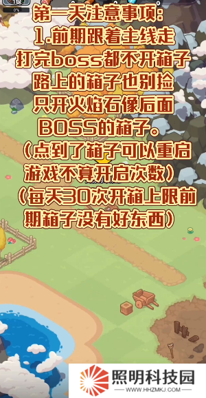 1、前期跟著主線走,打完boss都不開箱子,路上的箱子也別撿,只開火焰石像后面boss的箱子(點到了箱子可以重啟游戲)。