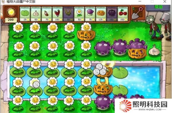 2、你在完成金幣植物以及攻擊植物的布置之后,注意留兩百個陽光,以免蒜頭或者南瓜頭被吃掉。