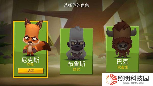 1、玩家們在下載安裝完成之后啟動游戲,首先需要從三種不同的動物角色之中進行選擇,它們會分別擁有均衡、結實、攻擊性這三種特性。