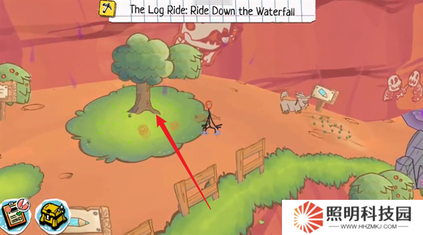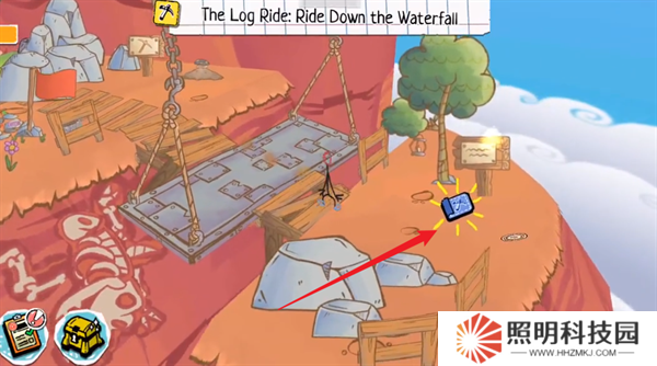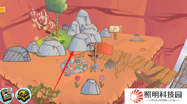 1、玩家們首先需要跟隨著劇情來進行冒險,在地圖上面拾取帶有工具圖案的畫板,比如在懸崖旁邊拾取到鎬子的畫板。