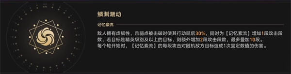 敵人擁有虛韌性,且弱點被擊破時使其行動延后30%,同時為【記憶紊流】增加1段攻擊段數,若目標是精英級別及以上的目標,則額外增加2段攻擊段數,最多疊加10段。