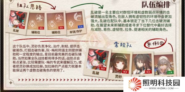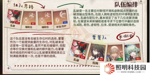 陣容思路:當隊伍是沒有擊破生存位時的選擇,藿藿作為一個能提供能量的生存位,對亂破來說還是有一定增益效果,雖然不能無縫循環,但配合等價交換光錐和亂破的額外能力。