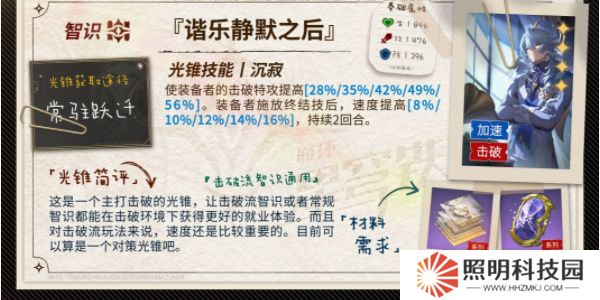 光錐效果:作為目前擊破流智識的唯一四星光錐,滿疊影時提供接近1疊專武的擊破特攻,此外還有施放終結技后加速的效果,持續時間2回合是可以覆蓋亂破的爆發期的,一定程度上能加快爆發期的出傷速度。