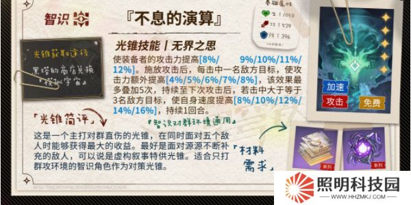 光錐效果:該光錐提供的是攻擊力加成,場上敵人越多增益越高。此外還有只要對方有三個敵人就可以無縫維持的加速效果,雖然不提供擊破增益,但攻擊力和加速效果也還不錯。