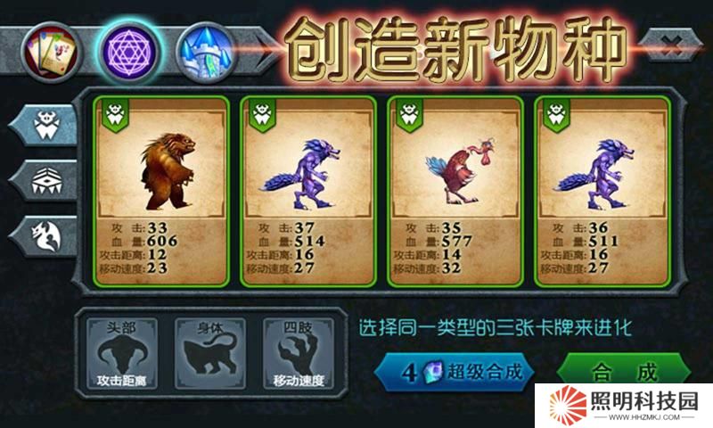 2.游戲內(nèi)部還會(huì)存在著一個(gè)合成系統(tǒng),你將可以使用多個(gè)不同類(lèi)型的動(dòng)物卡牌,來(lái)將其合成出一個(gè)強(qiáng)大的融合物種。