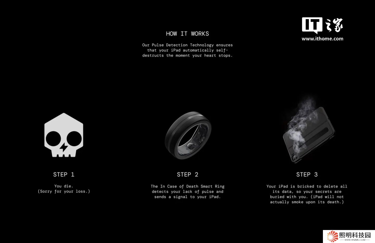該公司強(qiáng)調(diào),該系統(tǒng)能夠識別戒指是否從手指上取下,因此不會在每次充電時(shí)誤觸發(fā) iPad 的自毀功能。Zugu 在這款頗具黑色幽默色彩的產(chǎn)品上加入了一些趣味性設(shè)計(jì),提供了多種“死亡保護(hù)”選項(xiàng),用戶可以選擇單獨(dú)或組合使用。