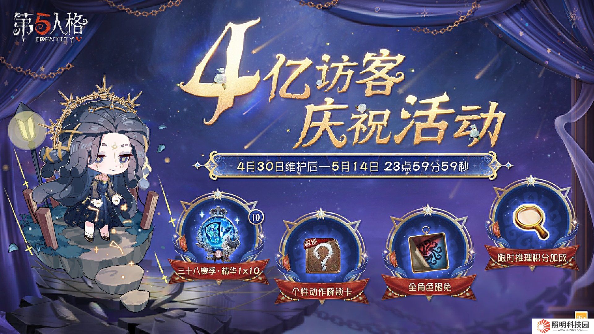4億訪客慶祝活動將于4月30日維護后開啟。活動期間登錄游戲,即可收到內含【第三十八賽季·精華1×10】和【個性動作解鎖卡】的贈禮,全角色限時免費和限時推理積分加成也將同步開啟~