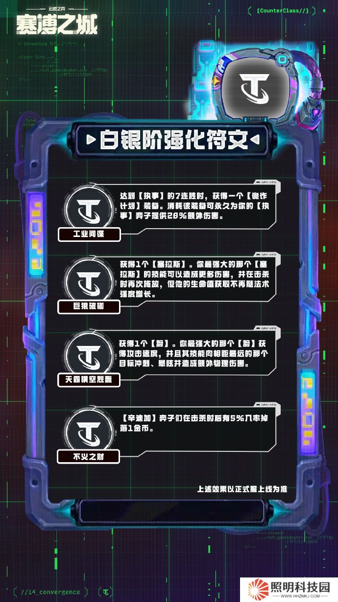 云頂之弈即將迎來S14賽季賽博之城,在這個賽季將會上線全新的白銀階強化符文,那么大家知道白銀階強化符文究竟是怎么樣的呢?下面快跟隨本站小編為大家帶來的云頂之弈S14白銀階強化符文吧。