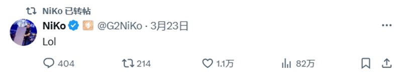 賽后NiKo轉發了自己3月23日的動態:哈哈哈。