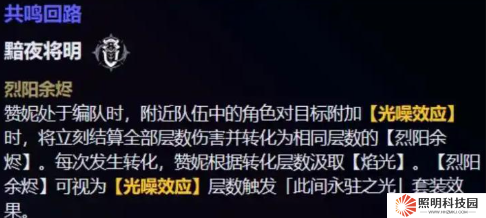 共鳴回路這一塊意外的簡單,贊妮處于編隊的時候,附近隊伍中的角色對目標附加光噪時,立刻結算全部層數傷害并轉化成相同層數的烈焰余燼,每次發生轉化,贊妮根據層數汲取焰光,這個同樣可以觸發新光套。