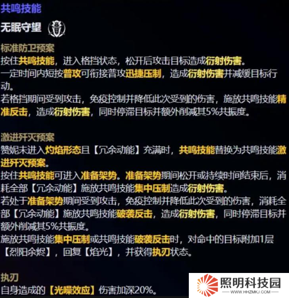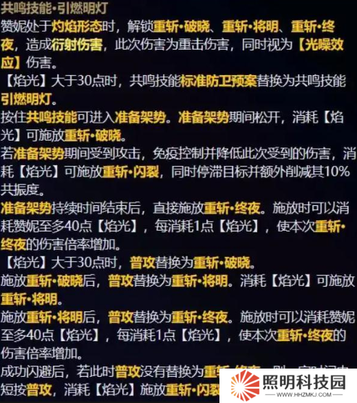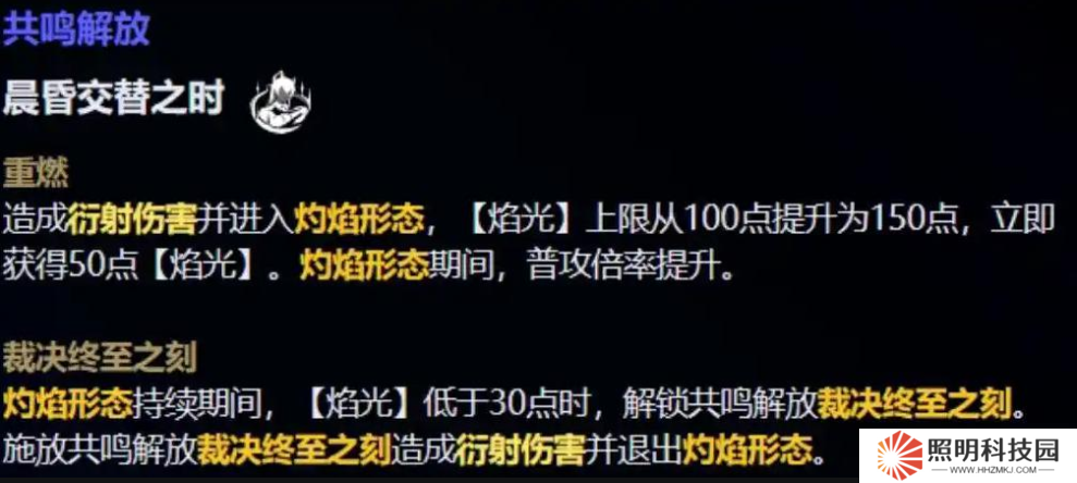 而開大招后的第二形態,共鳴技能就發生變化了,根據焰光的點數不同,造成的效果也不一樣,除了格擋之外,這里的主要輸出傷害定位是重擊傷害。