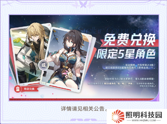 3.2版本更新后-3.4版本結束前,開拓等級≥4級的開拓者可直接領取旅伴金靈*1。「旅伴金靈」可用于在商店「聚靈鑄星」中兌換限定5星角色「阮·梅(同諧·冰)」「羅剎(豐饒·虛數)」、常駐5星角色、變量骰子。
