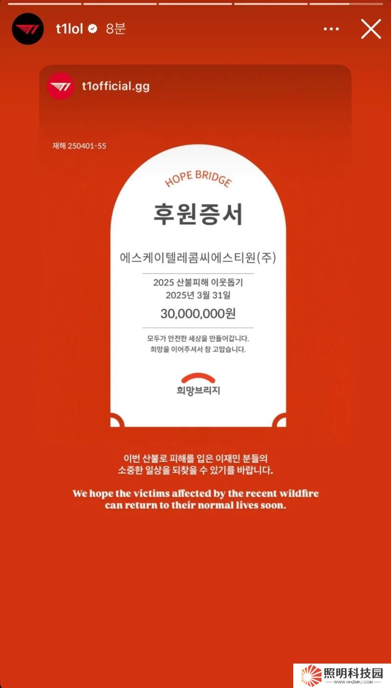 韓國東南部發生嚴重山火,T1捐款3000萬韓元,原內容翻譯如下:希望因本次山火受災的災民們盡快恢復日常生活。