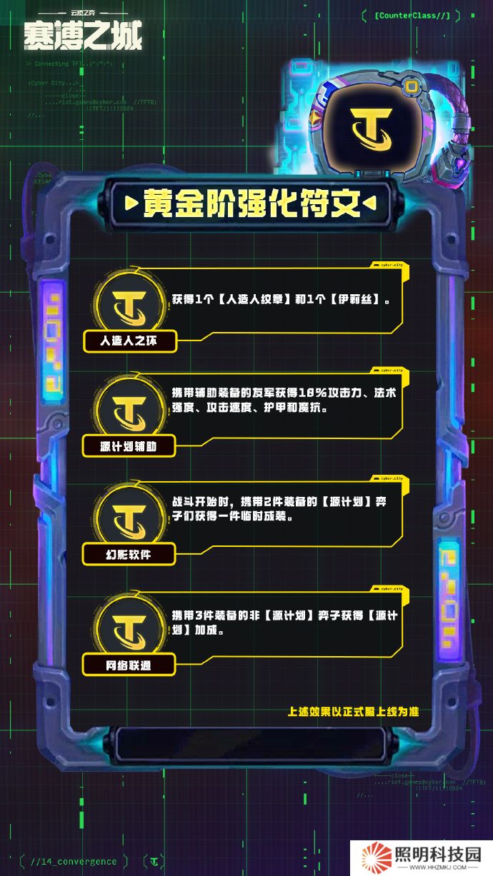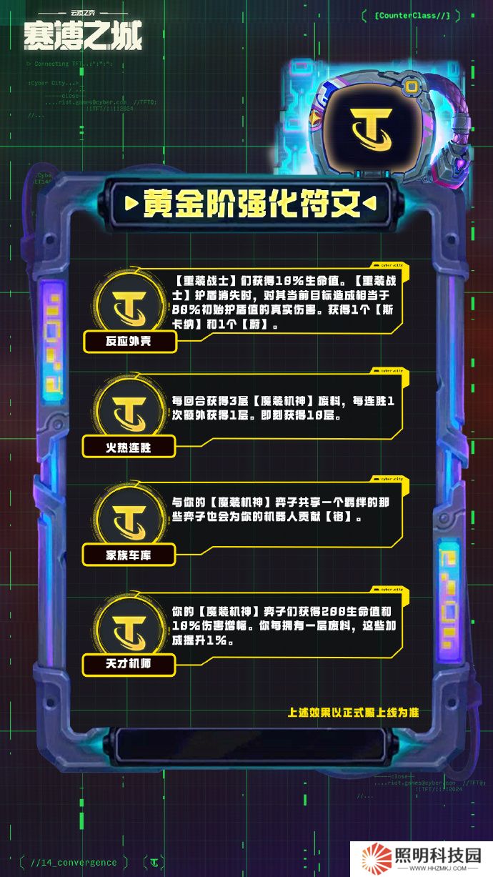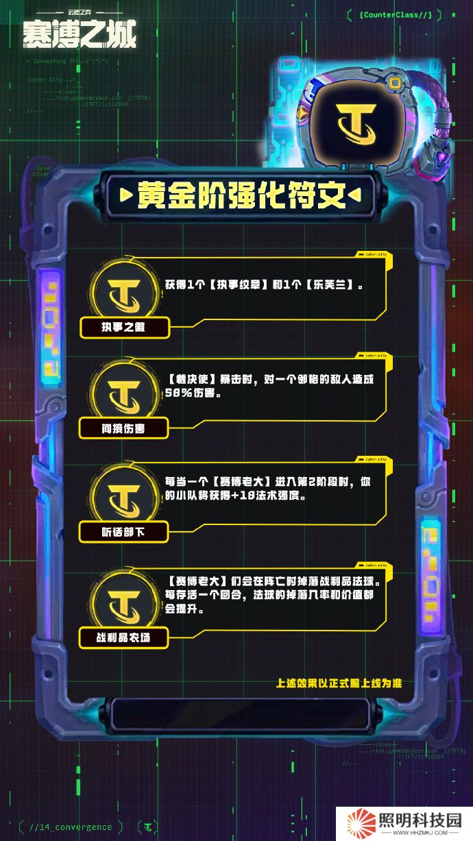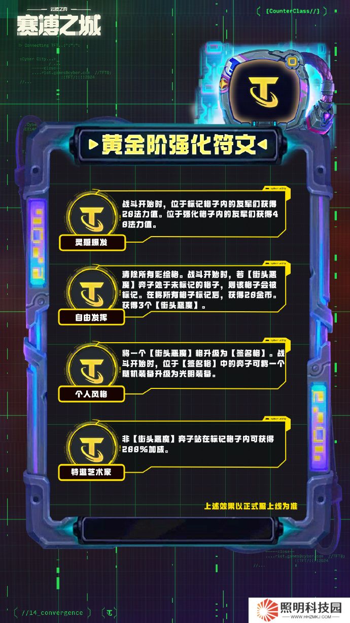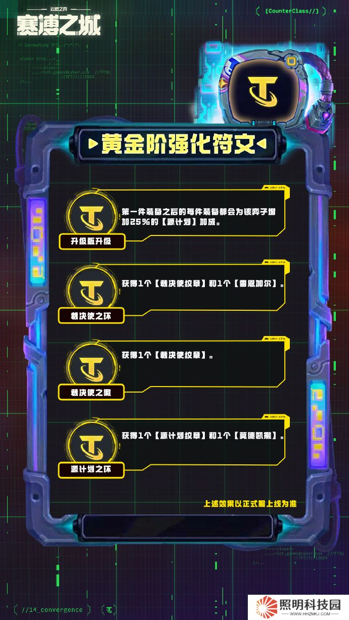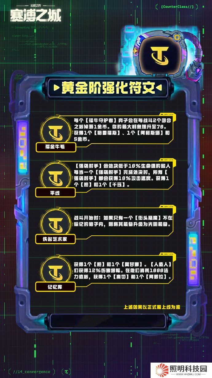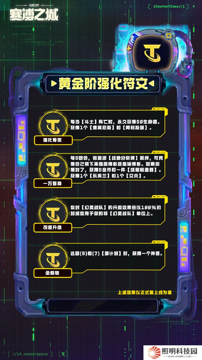 云頂之弈即將迎來S14賽季賽博之城,在這個賽季將會上線全新的黃金階強化符文,那么大家知道黃金階強化符文究竟是怎么樣的呢?下面快跟隨本站小編為大家帶來的云頂之弈S14黃金階強化符文吧。