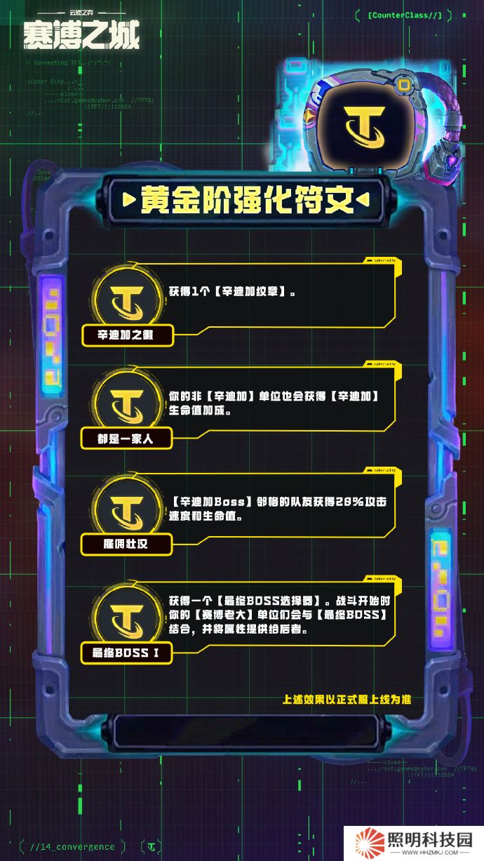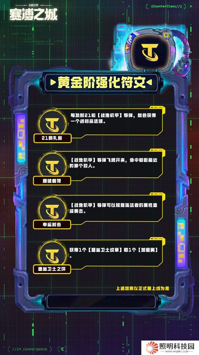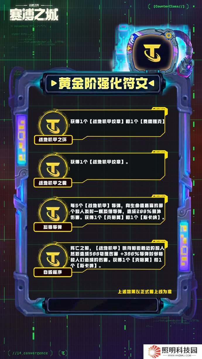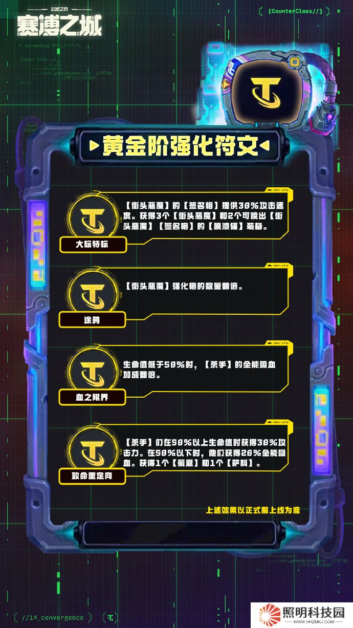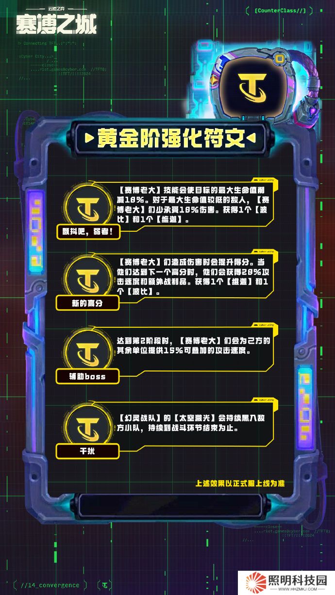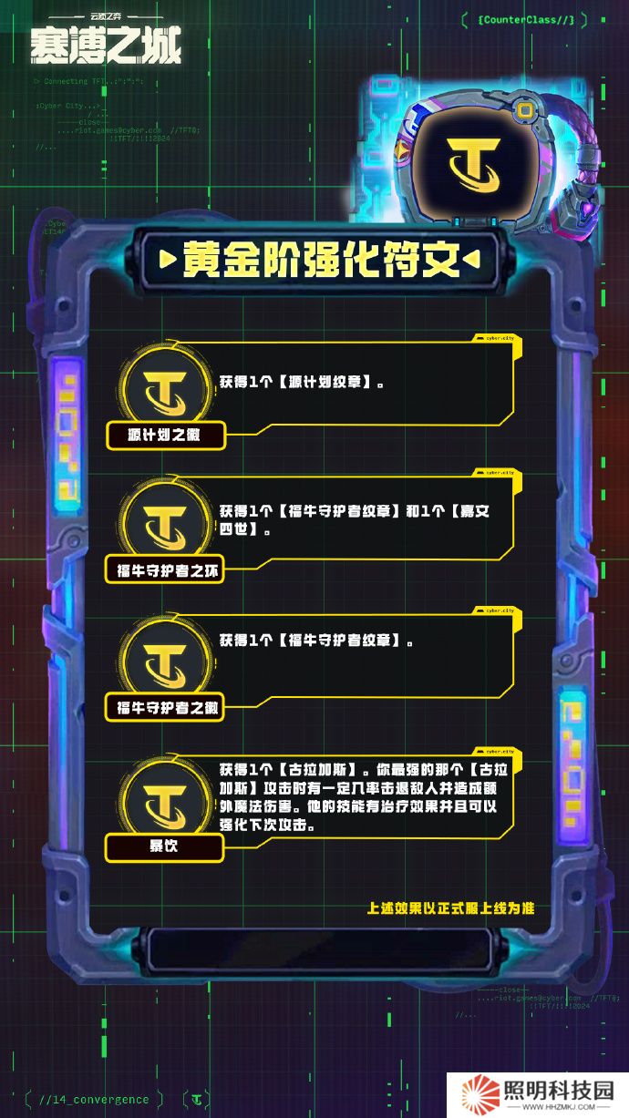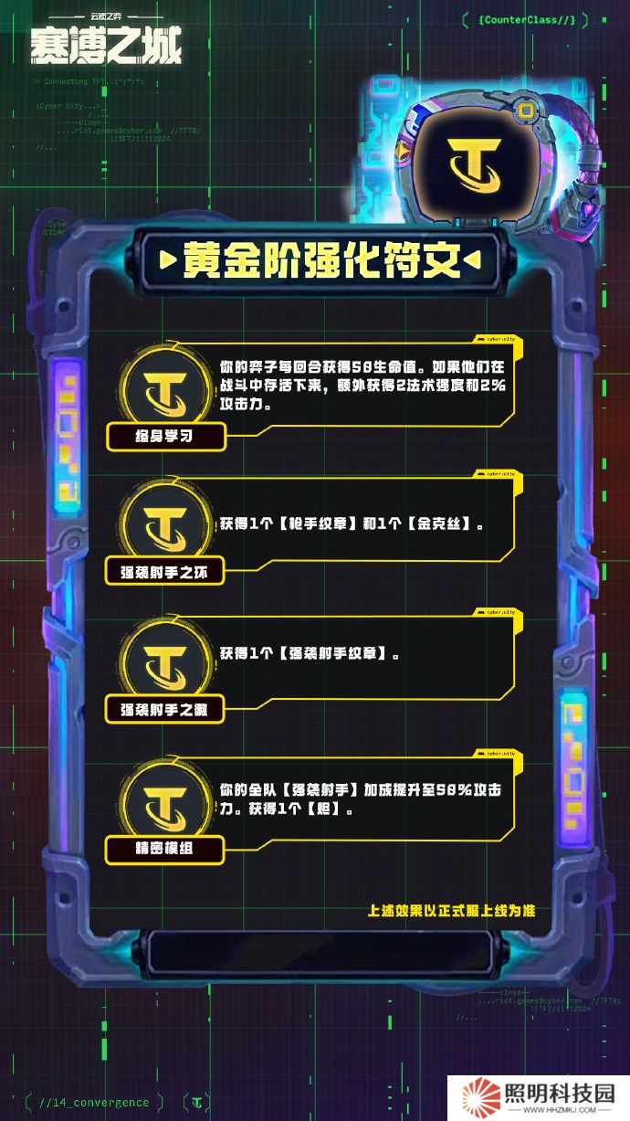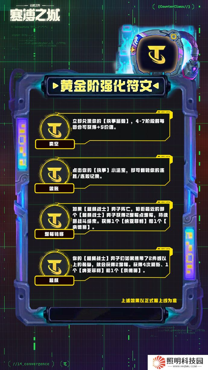 云頂之弈即將迎來S14賽季賽博之城,在這個賽季將會上線全新的黃金階強化符文,那么大家知道黃金階強化符文究竟是怎么樣的呢?下面快跟隨本站小編為大家帶來的云頂之弈S14黃金階強化符文吧。