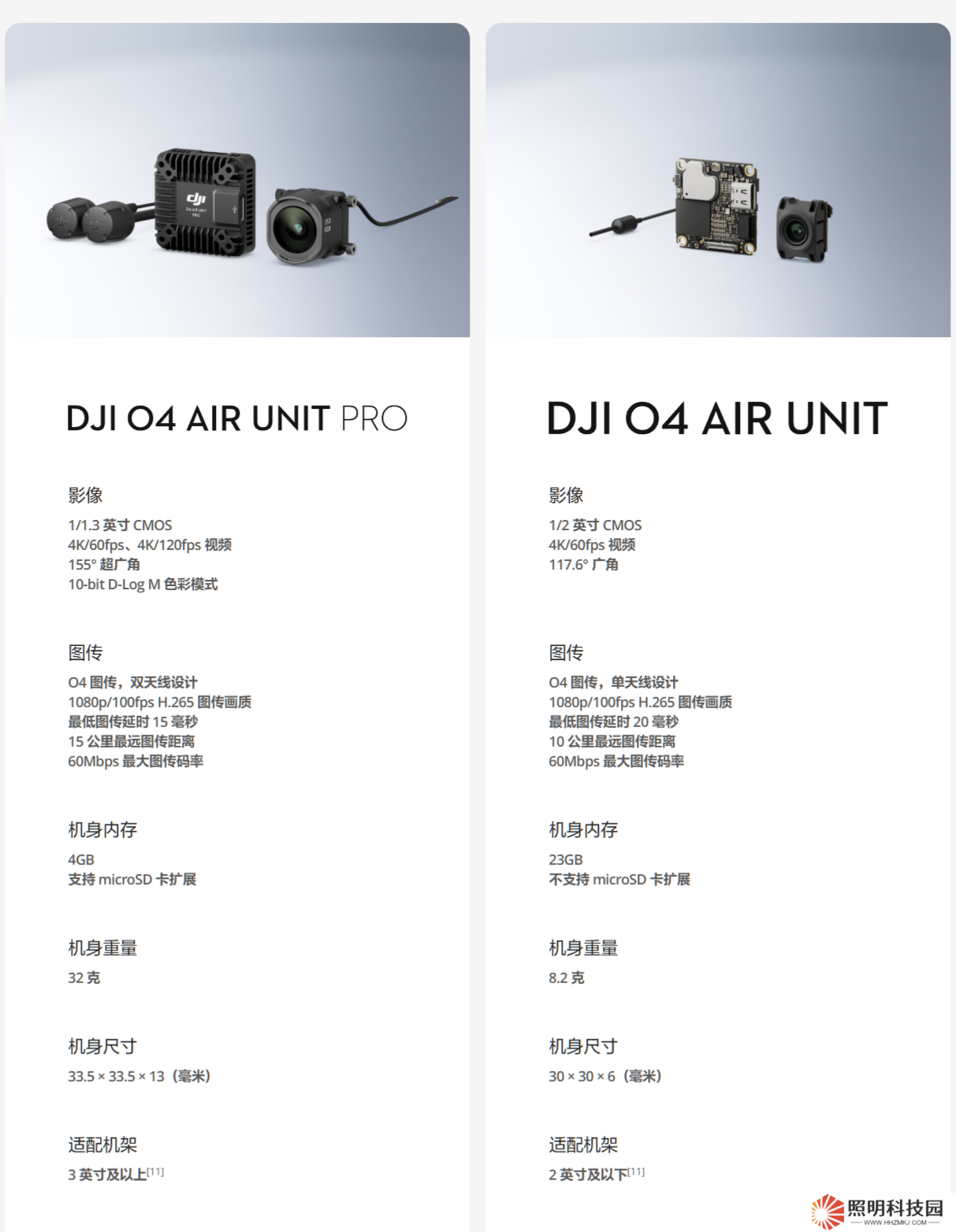DJI O4 Air Unit Pro 則采用 1/1.3 英寸影像傳感器,可拍攝 4K / 120fps 視頻,具備 10-bit D-Log M 色彩模式和 155° 超廣視角等功能。