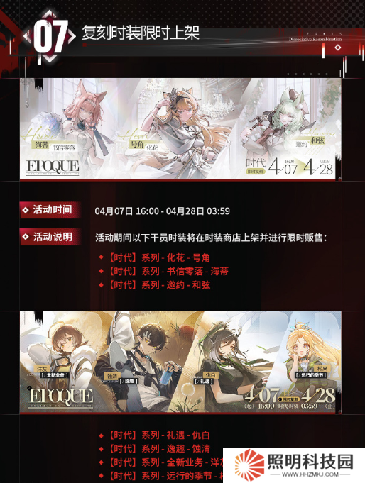 復刻時裝限時上架,包括時代系列的皮膚,包括號角、海蒂、和弦、仇白、蝕清、洋灰、送過、音律聯覺系列的流明、艾麗妮、羅比菈塔、銀灰、霍爾海雅、琳瑯詩懷雅、瑪爾特系列的斯卡蒂